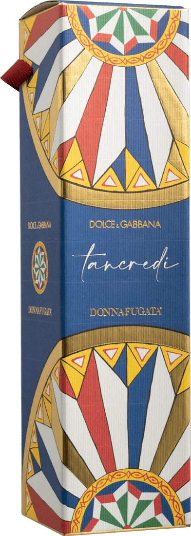 Der Name Tancredi erinnert an einen der Protagonisten des Leoparden, eine unerschöpfliche Inspirationsquelle, auch für Dolce & Gabbana. Im Roman und im gleichnamigen Film ist Tancredi der Lieblingsneffe des Prinzen von Salina, aufgrund seines Charmes und seiner Fähigkeit, sich an Veränderungen anzupassen. Mit einem leidenschaftlichen und unwiderlegbaren sizilianischen Charakter wurde Tancredi 1990 aus einer innovativen Mischung einer einheimischen mit einer internationalen Rebsorte für diese Ära geboren. Dolce&Gabbana hat das koordinierte Image der Limited Edition dieses „revolutionären“ Weins geschaffen, das dem Leoparden und insbesondere dem Kontrast zwischen Tradition und Moderne huldigt, und den Charakter des Tancredi zusammenfasst: während das Gold, das Blau und die gewundene Linien barocker Inspiration die Pracht der Aristokratie in ihrem Niedergang feiern, so erinnern das Rot und Grün sowie die spitzen geometrische Figuren an die neuen revolutionären Werte, die in Sizilien nach der Vereinigung Italiens entstehen und die den Auftakt zur Zeitgeschichte der Insel bilden